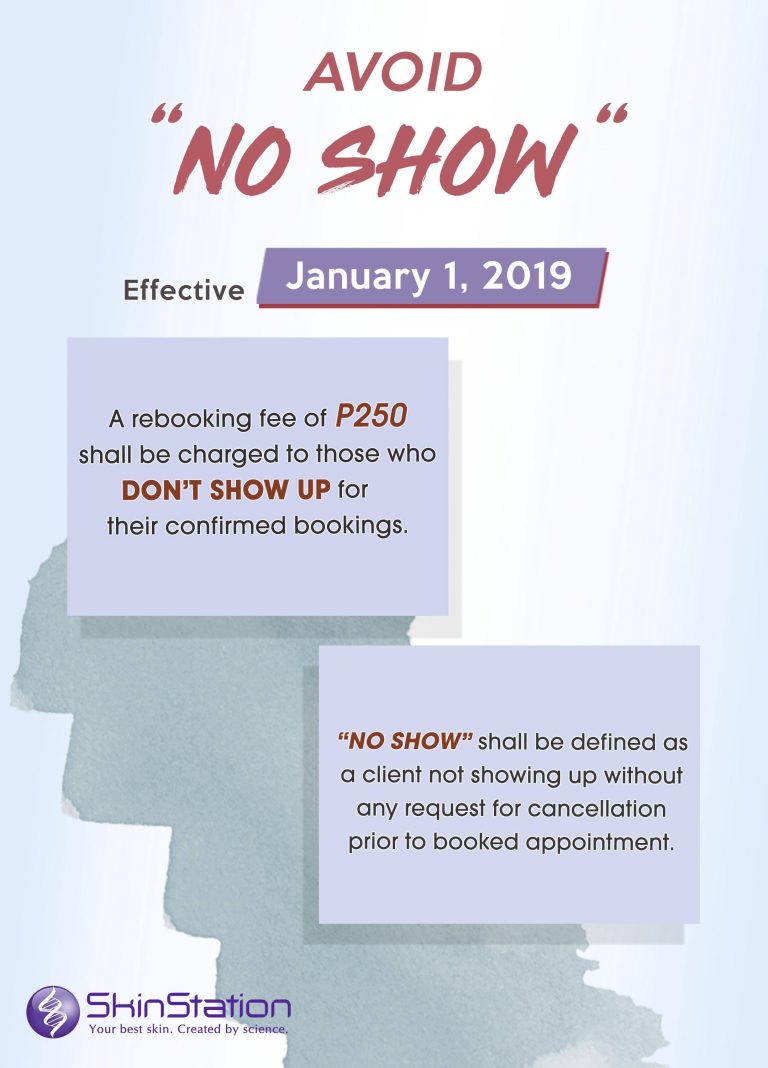 Appointments may be cancelled by sending e-mail to info@skinstation.ph or contacting us at 0917 583 4569 or 0998 589 4569. No fees will be charged.